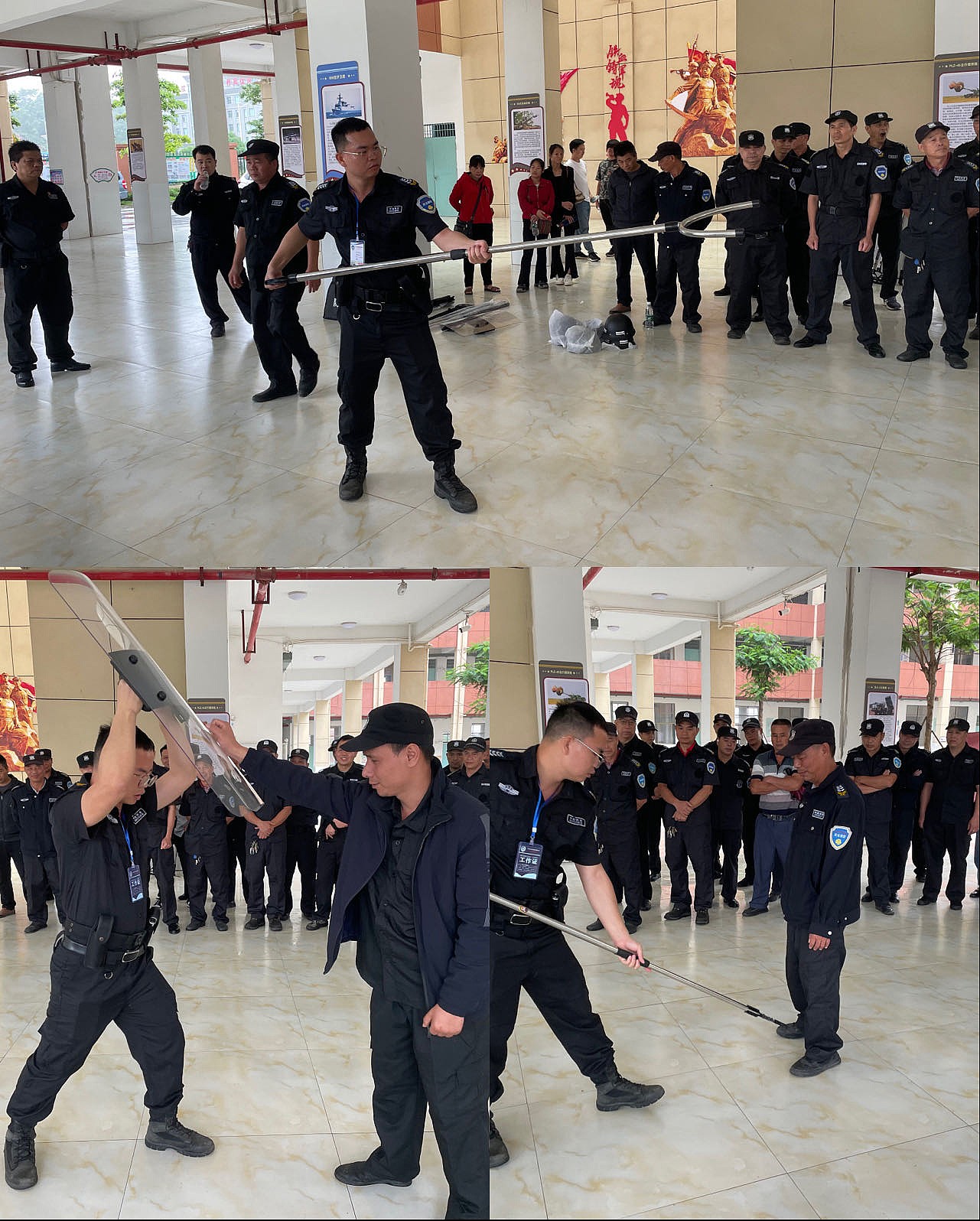 理論知識授課結束后,治安管理大隊劉警官和彭壬教官現場對安保器械進行示范演練,耐心細致地講解盾牌、警棍、鋼叉等使用方法和實戰技巧,將動作要領毫無保留傳授給保安人員。消防救援大隊教官組織參訓人員進行消防水帶連接、使用滅火器撲救初期火災實操訓練。講授完畢后,要求參訓人員再次一對一進行演練,并逐一手把手給予指導,使受訓人員更牢固更熟練掌握所學技能。