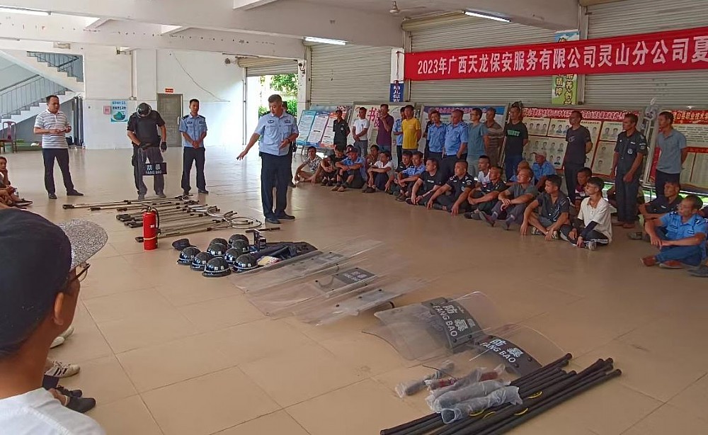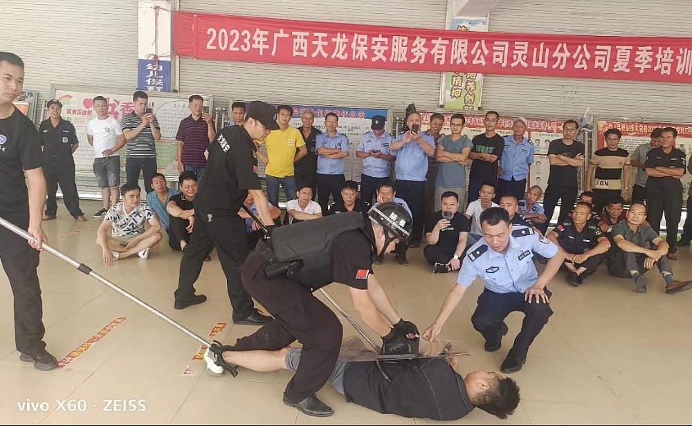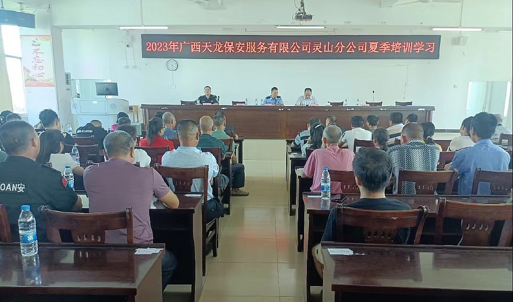 為全面提升靈山縣保安隊伍的專業素質,更好地服務社會、服務全縣人民,近日,靈山縣公安局治安管理大隊和廣西天龍保安服務有限公司靈山分公司在靈山縣職業技術學校聯合舉辦暑期保安員培訓活動。靈山縣各中小學校、民辦幼兒園、看護點、校外托管培訓機構在崗保安員以及其他企事業單位保安員接受了培訓。靈山縣公安局治安管理大隊、三海派出所、廣西天龍保安服務有限公司靈山分公司等單位有關領導出席培訓活動,同時派出多名教官進行授課指導。