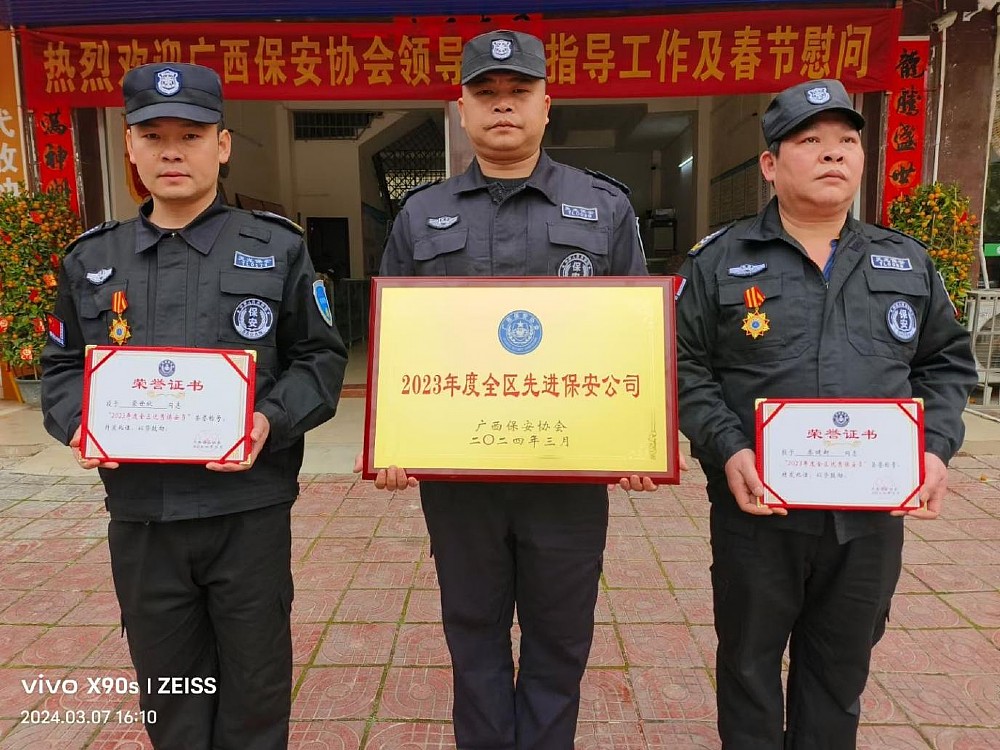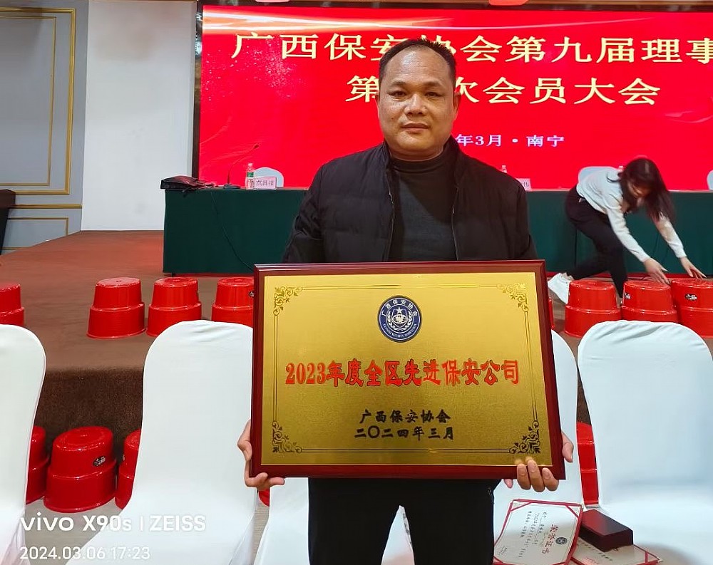 3月6日,廣西保安協會第九屆理事會第二次會員大會在南寧順利召開,大會對2023年度優秀會員單位和表現突出保安員進行了表彰,并頒發牌匾和證書。廣西天龍保安服務有限公司榮獲“2023年度全區先進保安公司”榮譽稱號,公司蒙世秋、秦健新兩名優秀同志榮獲“2023年度全區優秀保安員”榮譽稱號。